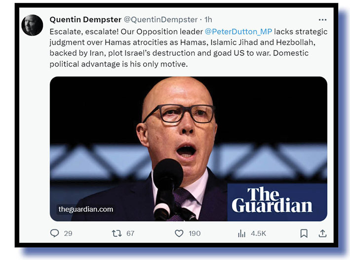 … while Quentin Dempster and Michael Springer tackled Peter Dutton, his focus always on opportunities for division, for his totally expected demands that Australia should have voted no at the UN and that Albanese should fly immediately to Tel Aviv, strap a safety retrieval rope to at least one of his legs and crawl up the arse of Prime Minister Benjamin Netanyahu.