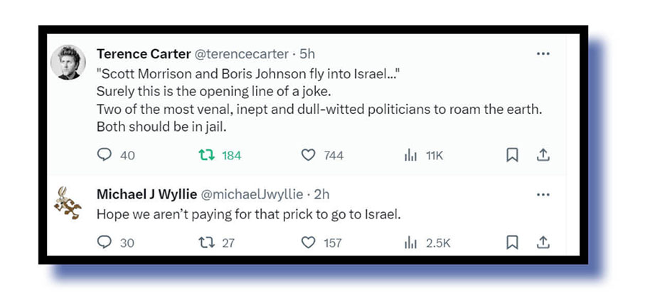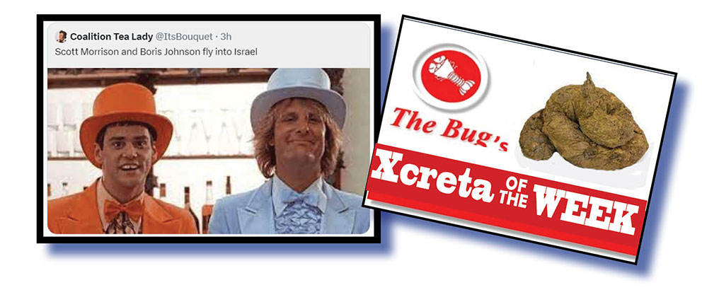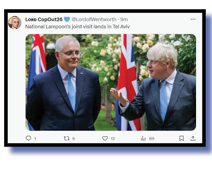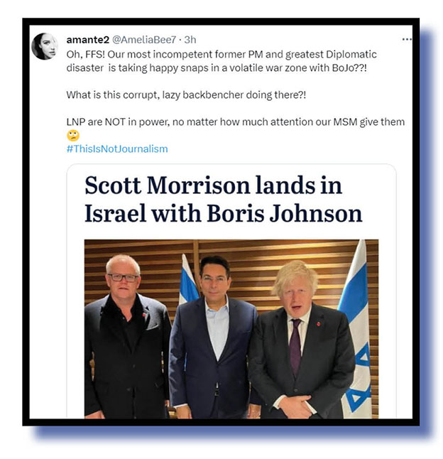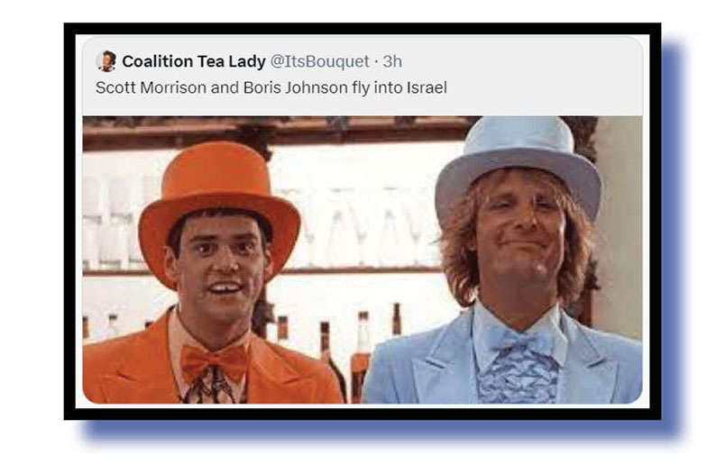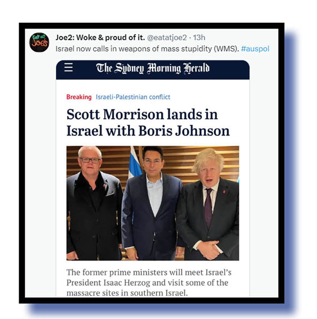 And, so, right on cue, two discredited ex-prime ministers – the UK’s Boris Johnson and our very own Scott Morrison – lobbed in Israel to wish the Zionists every successful kiddie and other innocent civilian death in Gaza as they defended their right to exist.