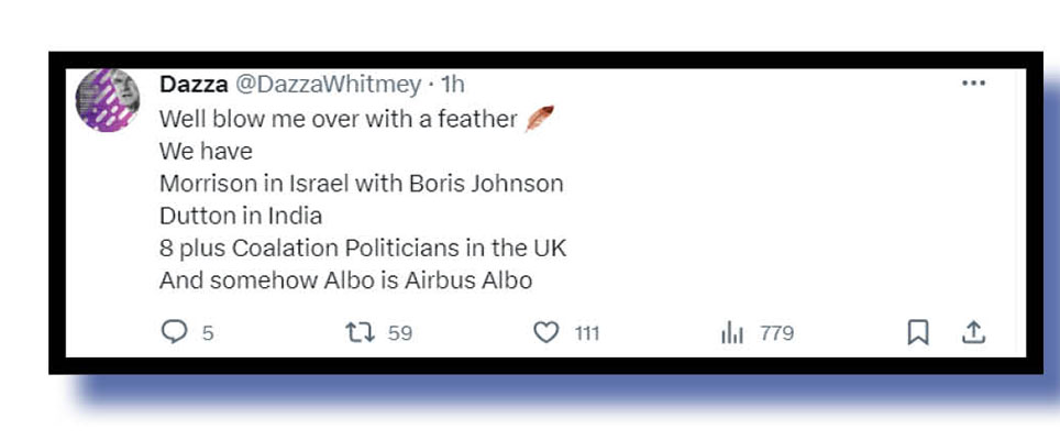 Amante2 joined in with some damn fine descriptions of Scott Morrison while Michael J Wyllie asked a very reasonable question in a dialogue with Terrence Carter, who rightly saw the visit by these two disgraced and rejected politicians as surely the first line of a joke, which we shamelessly pinched for the heading to this post.
