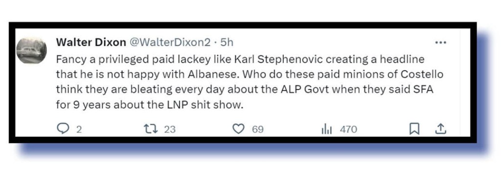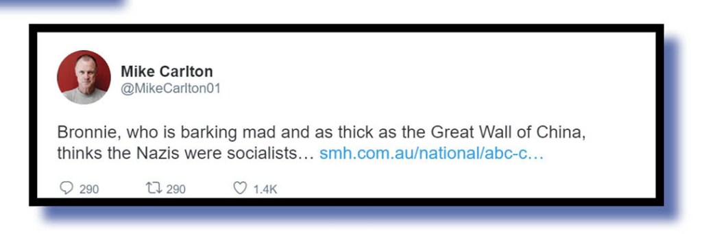 … while on more general politics matters, Walter Dixon gave Nine’s Today’s Karl Stefanovic a fine spray and Mike Carlton didn’t miss Bronwyn “Pop into this kerosene bath, love!” Bishop for recent comments in the SMH.