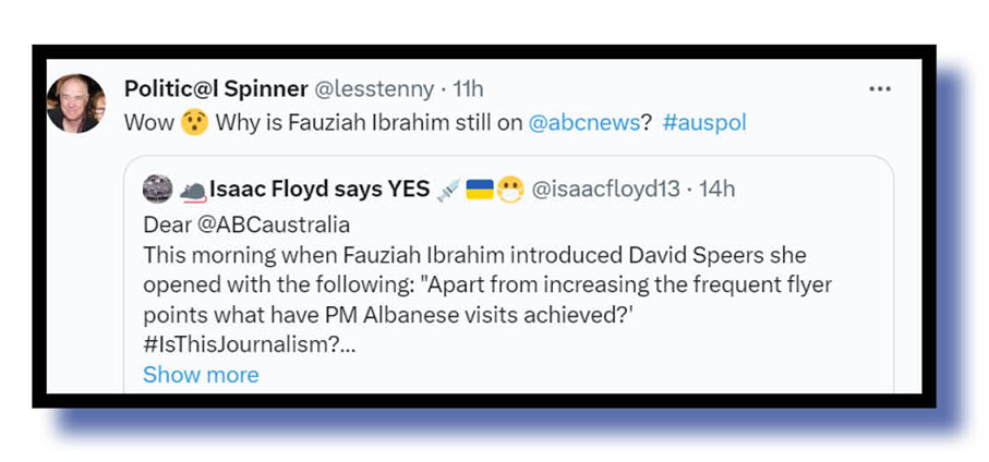 The Bug agrees completely with both Xcretas! How the fuck is Fauziah Ibrahim still employed at the ABC? We accept that’s a really silly question because the simple fact is that current ABC head honcho Ita “Newscorpse made me the gal I am today!” Buttrose would find absolutely nothing wrong with what Ibrahim said. Ita probably wishes her staffer had thrown in “Airbus Albo” for good measure. And, right there, is Aunty’s ongoing problem and a large part of the reason for its ongoing slide as a trusted news organisation.