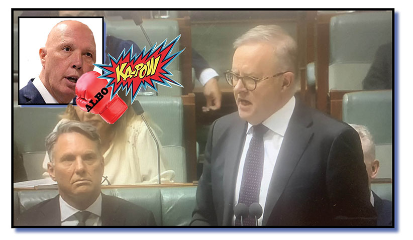 Just a couple of times with the appropriate glove-on-chin thump, because from all accounts – except those to be seen or heard on the ABC – Albanese gave Dutton quite a thumping after the Opposition Leader attempted to blame the Labor government for widespread community division for not being far more sympathetic to Jewish people who’ve had to put up with all that shocking footage of thousands of dead Palestinian kiddies. Kapow! Thump!
