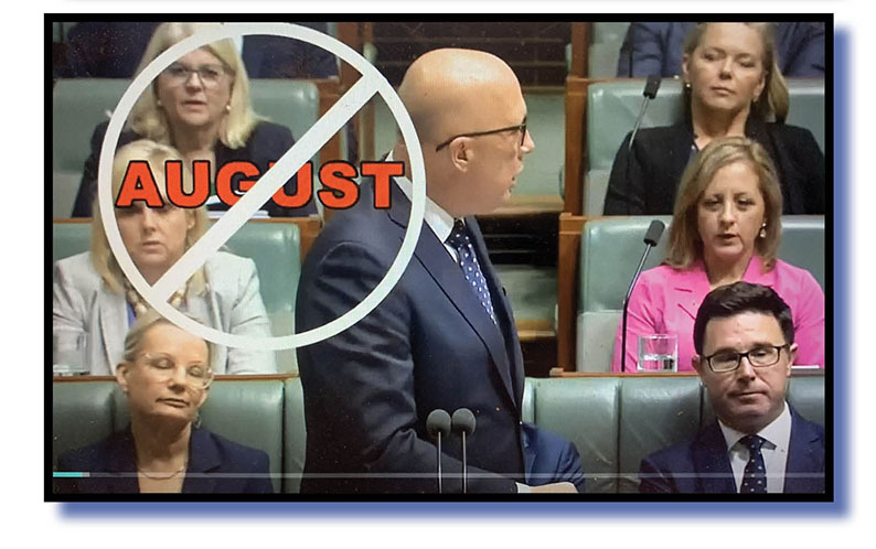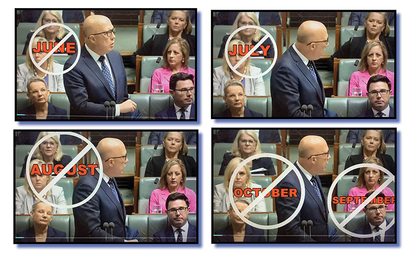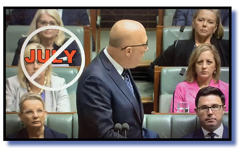 “Was it drafted in July?” Dutton asks as a July banned stamp appears on screen, once again accompanied by a little stamping sound that, to be fair, could have been overdone and far too trumpish – sorry, thumpish – and more “Nos” from his front and back benches.