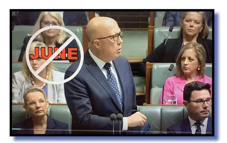 “So, was legislation drafted in June?” Dutton asks as a June banned stamp is inserted on the footage with a nice little stamping noise and Dutton’s mob loyally and enthusiastically shouts “No!”
