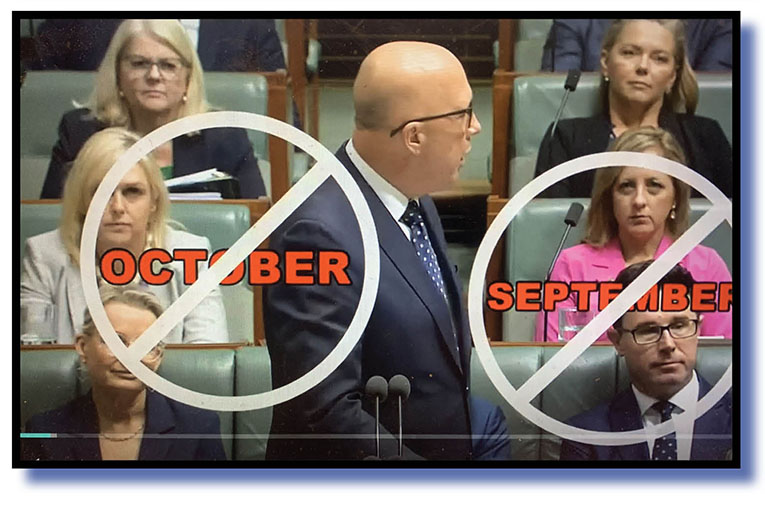 “Was it drafted in September or October?” Dutton asked, with a double anti-logo stamping with sound effects. Hmmm, stamping. Maybe by now, his supporters could have been stamping their feet as well instead of maintaining the “No!” chorus.