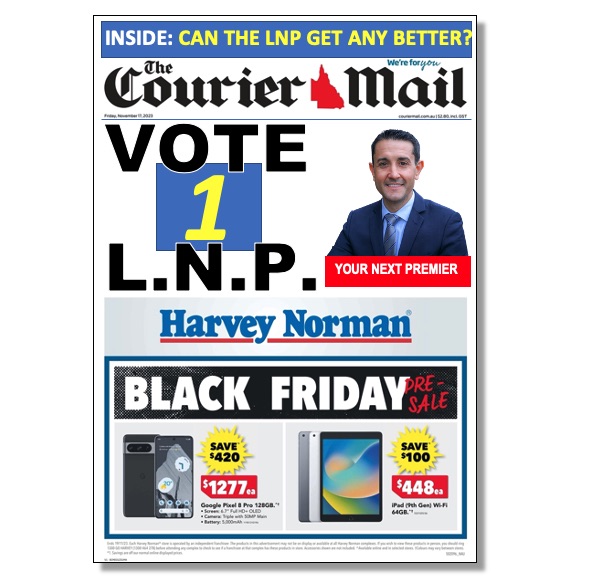 Who knows? But what our MGH teams are certain about is that shutting down the goldmine that is the guaranteed Harvey Norman front page ads is the only way The Courier-Mail can fit more pro-LNP stories in prominent positions than it’s already publishing.