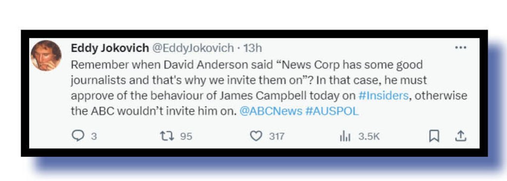 The appearance by this LNP publicist and sloth impersonator on the ABC’s Insiders on Sunday also caught the attention of Eddy Jokovich, Sahar Adatia and Su Dharmapala Votes Yes etc, etc.