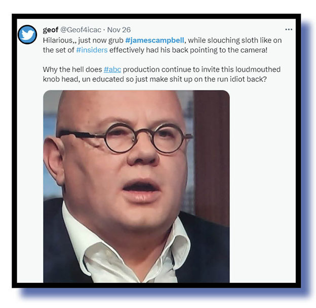 Anyway, enough about the repulsive faux journalist Campbell …. oh, bugger it! … one more from Geof won’t do any harm, especially seeing he’s summed up the man so well.