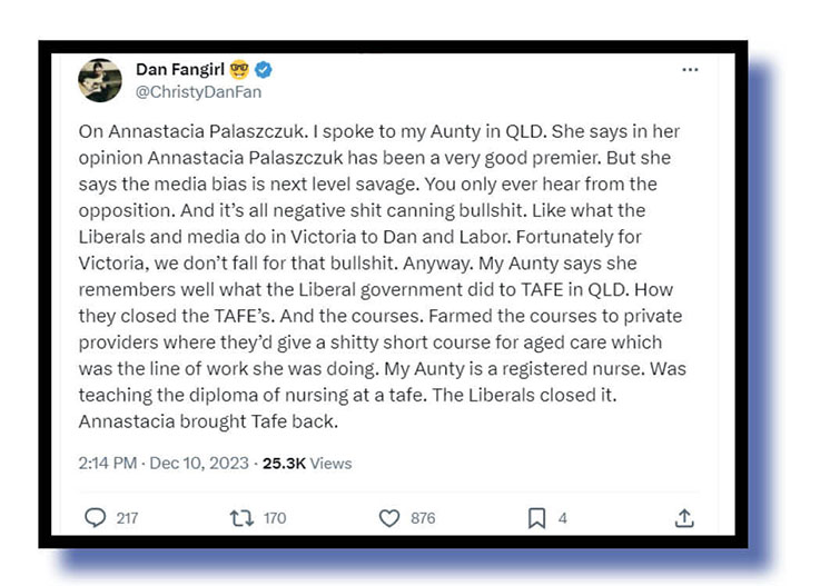 Phillip Riley also reflected on the amazing wins Palaszczuk achieved despite the Murdochracy’s “daily hate campaign” and bradpsychology took much the same line, while Peter Murphy praised the three Labor “Covid” premiers.