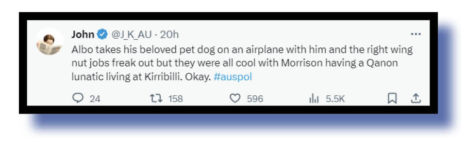 Now, let’s look at an issue that shows that Peter Dutton and the Opposition’s line of attack has really gone to the dogs. Let’s hear all about Totogate from Margie Jones in conversation with Joe2: Woke & proud of it, JayJay and John.