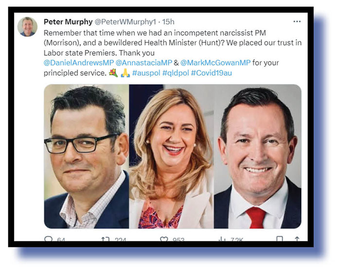 We should never forget that Morrison, backed by most of the mainstream mediocre, originally wanted to let Covid rip and that we should all learn to live and let die with it for the sake of business.