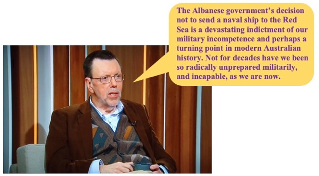 Sheridan has built his latest show around the Albanese Government’s decision against sending naval support to the Red Sea where Houthi pirates are terrorising international shipping.