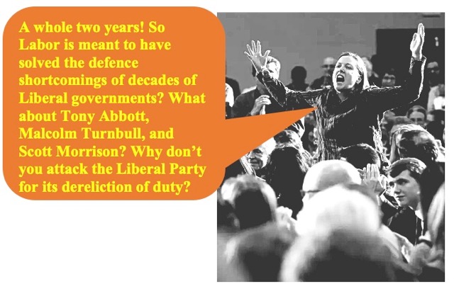 His current routine is based on the bizarre premise that Labor, having been in office for little more than 18 months is to blame for every shortfall in capability being exposed in the Australian Defence Forces after almost a decade of Liberal-National rule.