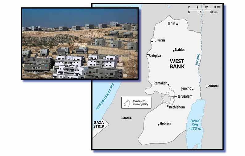 The move emboldened Jewish settlers, defended by the Israel Defence Force, to build a series of settlements in the western edge of the West Bank (at left of picture, above).