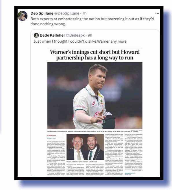 And let’s finish with sport and this from Deb Spillane, reacting to Bede Kelleher’s understandable own reaction to the news that David Warner loves John Howard.