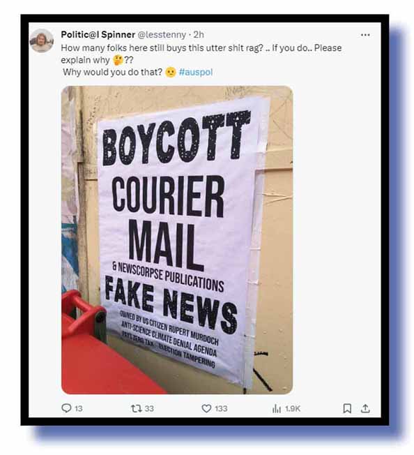 We are, of course, referring to The Courier-Mail so let’s hear first from Politic@l Spinner. We’re not sure what particular piece of risible right-wing rubbish offended Politic@l Spinner of late, but they are never-ending.