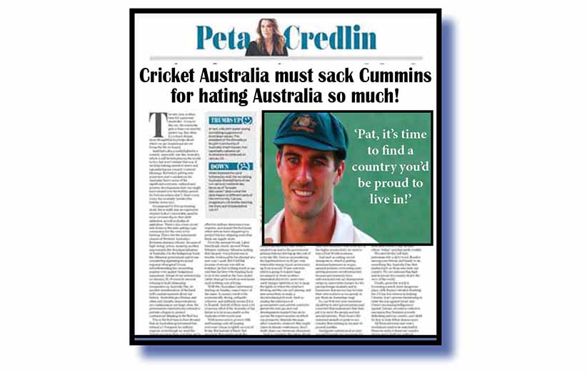Highly respected News Corp Australia columnist Peta Credlin is attracting solid support this morning after publication of her column (above) calling on Cricket Australia to immediately sack Test captain Pat Cummins for calling on a date change to Australia Day celebrations.