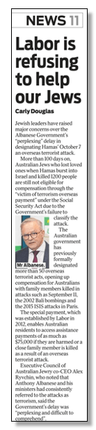 The Daily Tele’s treatment of the story blatantly accused the government of being anti-Semitic (below) by declaring as a matter of fact that Labor “is” refusing to help the Jewish people affected.