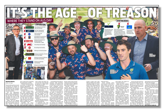 Then in the past few days as the Australia Day “debate” played out, the Tele rolled out the “treason” word in a story about those individuals or groups or businesses that are no longer so infatuated with the idea of a national knees-up on 26 January.
