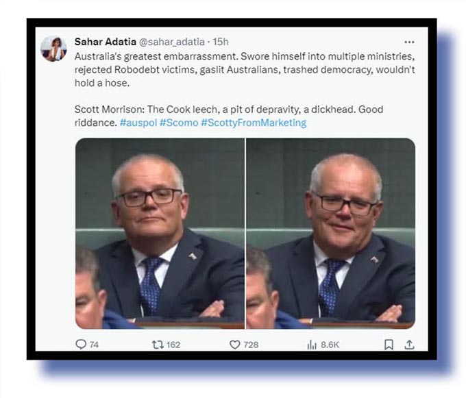 Okay, let’s now hear from MFW, Michael J. Wyllie and Sahar Adatia on the imminent departure from politics of the Liar from the Shire and the Crook from Cook, not to mention six of the finest members of the former Morrison ministry.