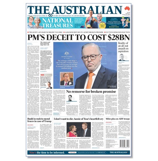 Like anyone giving Murdoch media outlets even a cursory glance, they have noted what has been a vigorous pro-Liberal Party advertising campaign dressed up as news coverage – perhaps more correctly, News coverage – in the Murdoch media after Prime Minister Anthony Albanese’s announcement that his government had finally decided to junk the Morrison Government’s plans for giving big tax cuts to some of the wealthiest Australians. (below)