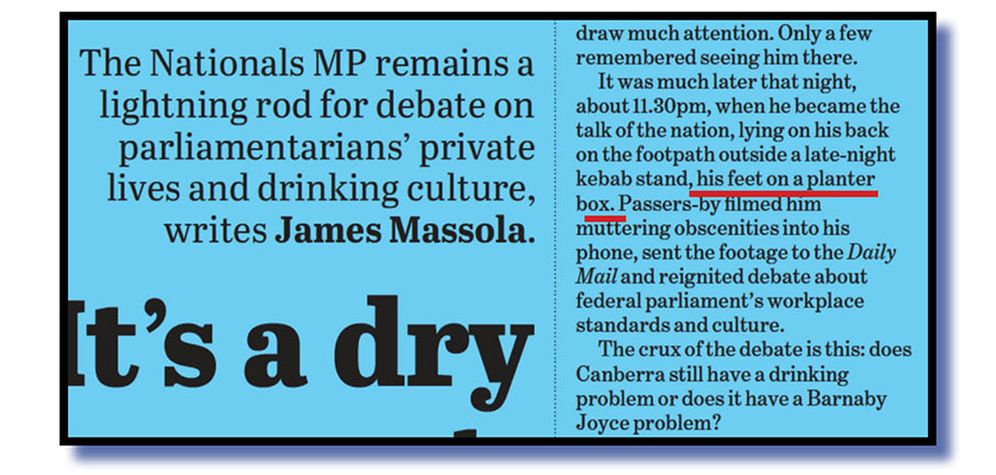 In the cover story in today’s The Sydney Morning Herald News Review section, barely a few paragraphs in, you say that Barnaby Joyce was pictured on that Canberra footpath with “his feet on a planter box”.