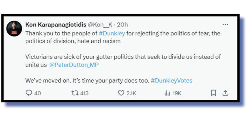 Can we just pause here to give those two delusional pollies a reality check? With no One Nation or United Australia Party candidates standing, the Liberals have achieved a smidge over 39 per cent of just about the entire right-leading primary vote! In a fucking by-election, mind, where Advance spent perhaps up to $400,000 besmirching Anthony Albanese and Labor with this racist, fear-mongering shit.