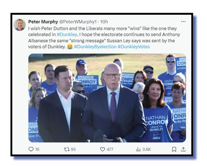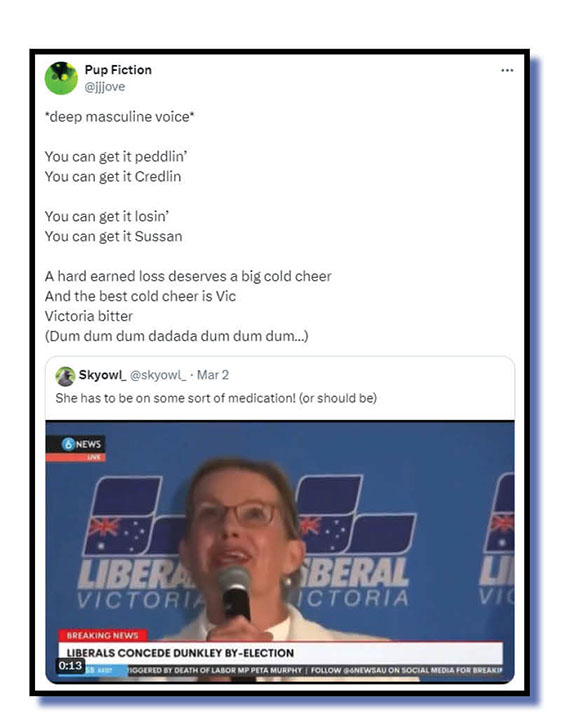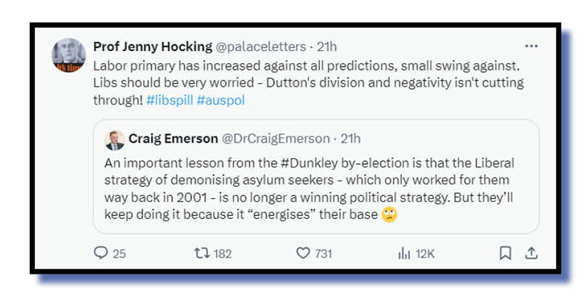 Much of the Xcrement that has flowed since the Dunkley byelection result on Saturday night has centred around the pathetic spin of the likes of Sussan Ley and Jane Hume that somehow the outcome has the Liberal and National parties on the springboard to victory if not the box seat at the next federal poll. Both ladies need professional help.