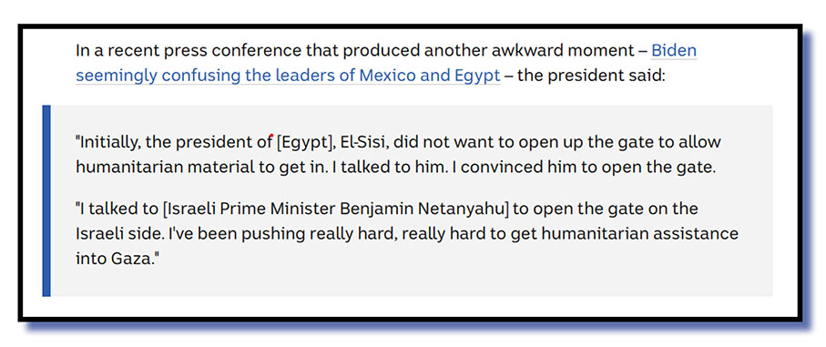 But what the bloody hell was Brad Ryan up to when repeating Biden’s words? He doesn’t use the word “Mexico” but puts “Egypt” in brackets instead? Sloppy, illogical journalism.