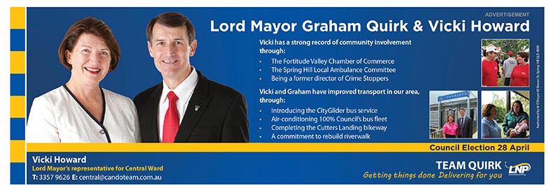 Both sides of politics probably use this sort of tactic, but the LNP advertising before the 2012 municipal poll that described Vicki as “the Lord Mayor’s representative in Central Ward” was red hot. As the CBD community paper The Independent that I was proudly part of at the time said, it was the perfect pitch for a ward that historically had a large turnover of voters every four years.