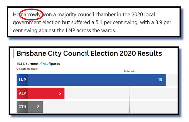 And, finally, a big cheerio to Savannah Meacham and William Ton who on the AAP’s online site this morning while reporting on the result of yesterday’s municipal poll in Brisbane had this to declare of Brisbane Lord Mayor Adrian Schrinner’s performance four years ago.