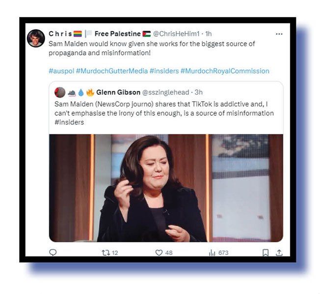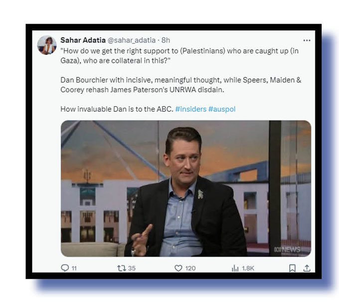 Terry Serio in conversation with Glenn Gibson, and Chris etc Free Palestine etc riffed on that general theme while taking aim at Samantha Maiden on the ABC Insiders program on Sunday.