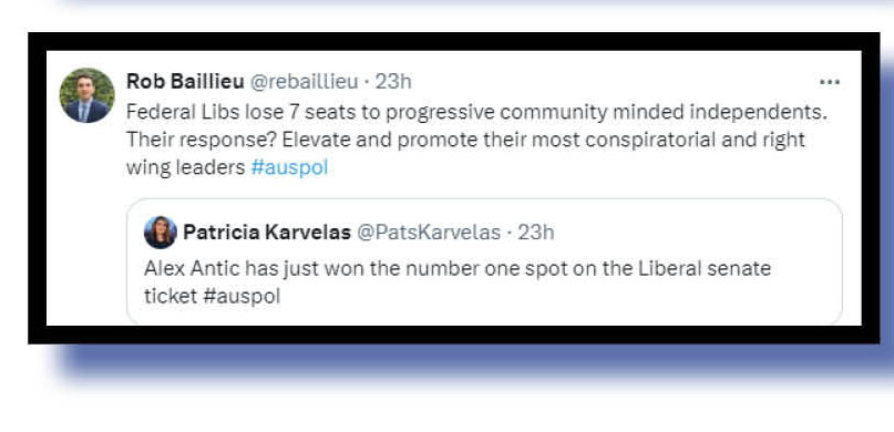 The selection by the South Australian Liberals to give Alex Anti the No1 spot on the state’s Senate ticket for the next federal poll sparked strong responses from amante2 and Rob Baillieu.