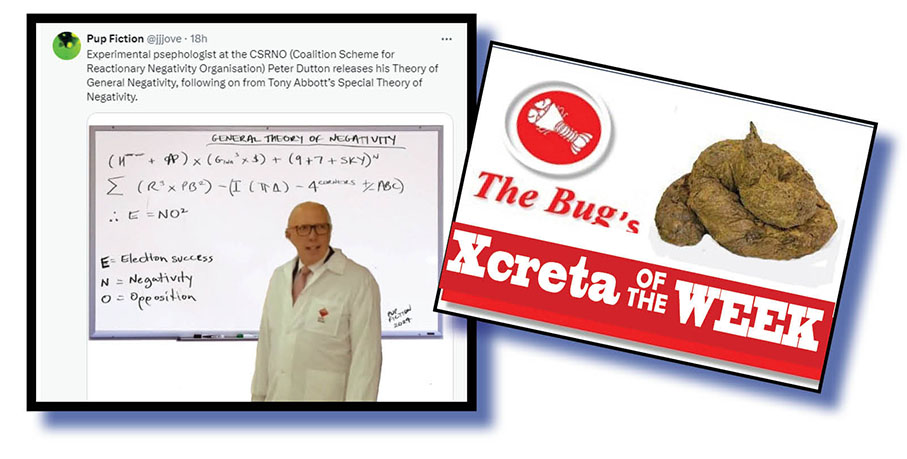 Our Excrement-of-the-Week judges couldn’t go past the effort put in by Pup Fiction (above and below) to take the mickey out of Peter Dutton as he exchanged blows with CSIRO on who had a better handle on nuclear theory!