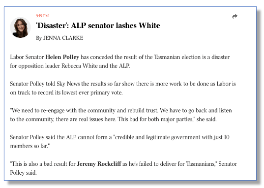 “Labor Senator Helen Polley has conceded the result of the Tasmanian election is a disaster for opposition leader Rebecca White and the ALP.” the story began.
