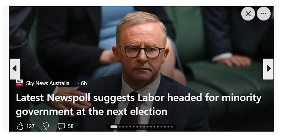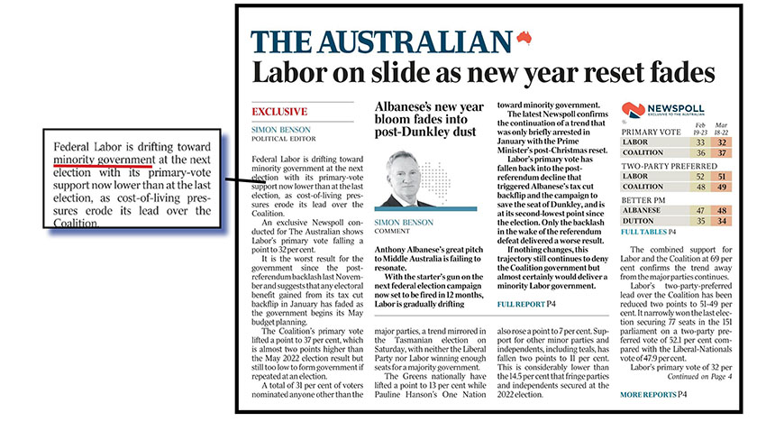 This is the question The Bug is asking after the interpretation given to the latest Newspoll by Newscorpse LNP publicity outfits, The Australian (above) and Sky News Australia (below).