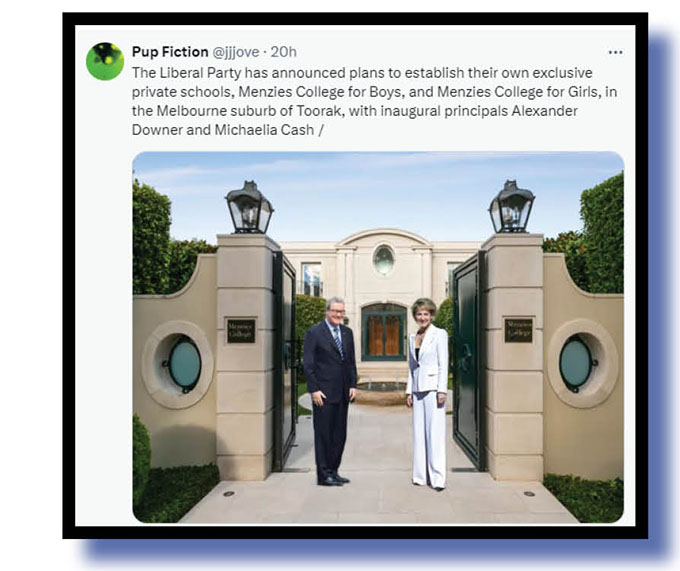 There’s an enormous plop of irony/sarcasm in Pup Fiction’s piece considering the Menzies concept of the Liberal Party has long been jettisoned by the cookers and religious nutters who now dominate the party he started. Ming must be spinning in his grave over the very thought of the likes of Michaelia Cash and Alexander Downer being the principals of colleges in his name, especially in Victoria where the Liberals rabble is so right-wing dominated.