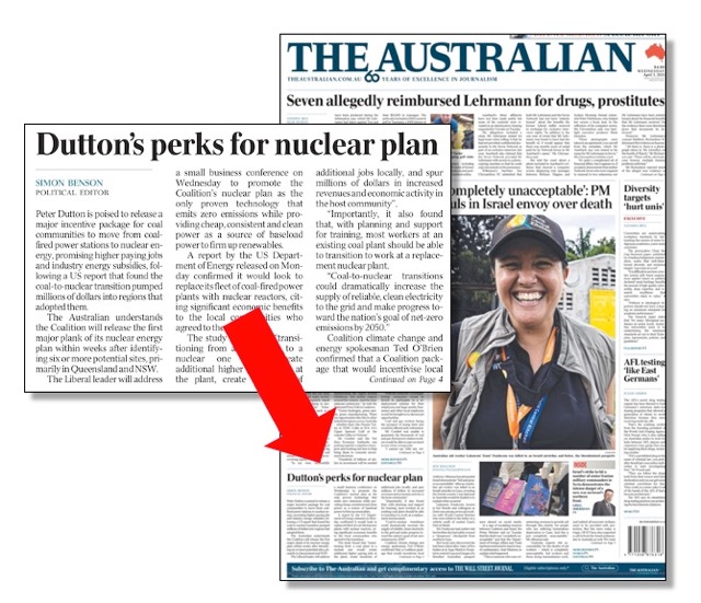 The federal Liberal Party’s advertising agency, News Crap Australia, continues to work hard on its main client’s nuclear power account.