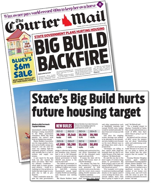 The story was an attack on the Labor Party government of Queensland Premier Steven Miles by peak building industry group, the Master Builders’ Association (MBA), which claimed the government’s public infrastructure program was hurting the residential development sector by causing building workforce shortages and materials supply scarcities.