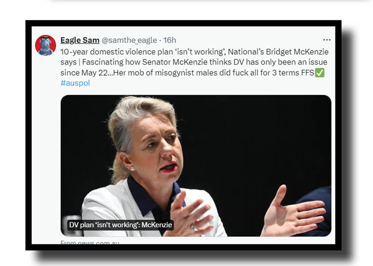 Giving Bridget McKenzie both barrels on the DV issue was Eagle Sam