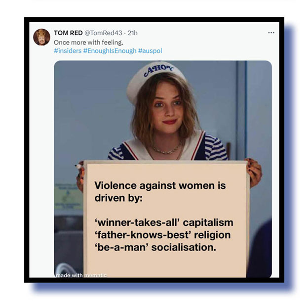 The other hot topic towards the week’s end was the horrific incidence of gender-based domestic violence and the massive rallies around Australia that called for a stop to men killing their current or former female partners. We liked this jibe at Janet Albrechtsen, possibly the only other person who could match Morrison for dreadfulness, from the prolific amante2.