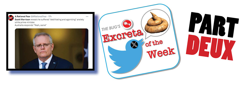 Firstly, our apologies once more for inflicting on all you BUGgers out there that loathsome, lazy, barrel of low-quality lard Scott Morrison in our first look yesterday at our Xcretas-of-the-Week.