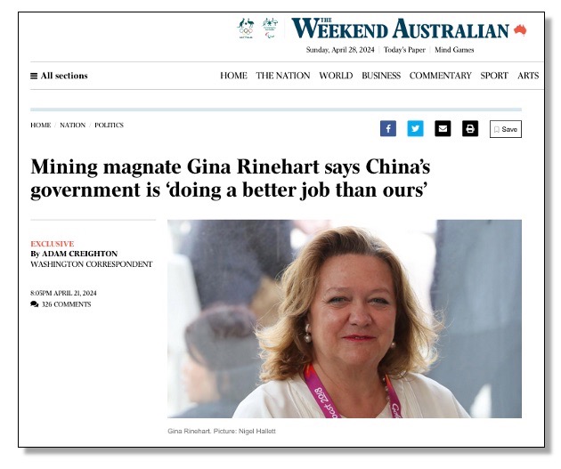 “On that note Adam also recently wrote a big story based on comments by far right-wing mining magnate Gin Rinehart who was complaining about all that was wrong with the nation – mainly the Labor Government in Canberra – and that the tyrannical Chinese communist regime does thing a whole lot better.