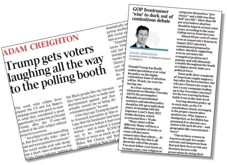 “So Adam is doing all he can to help by writing glowing stories about Trump including ones saying how funny the guy is on the campaign trail, how he uses humour to win over audiences and how ‘wise’ his stand on abortion – more correctly against abortion – has been. (below)