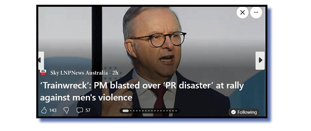 In the short online news story (at top) of what happened at that rally and the conversation between Elsworth and Pahani, Sky LNPNews reported that “Albanese was heckled at a ‘No More’ rally against men’s violence in Canberra over the weekend”.