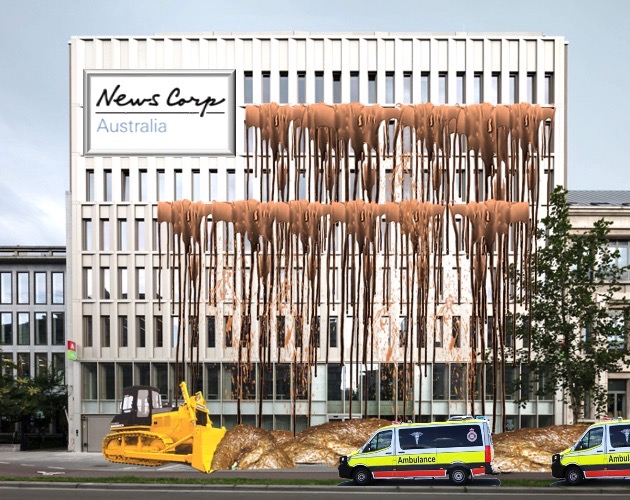 “Work is under way to clear the site of huge volumes of human faeces which officers at the scene advise have originated largely from the newsroom of The Australian,” the police spokesperson said. (main picture)
