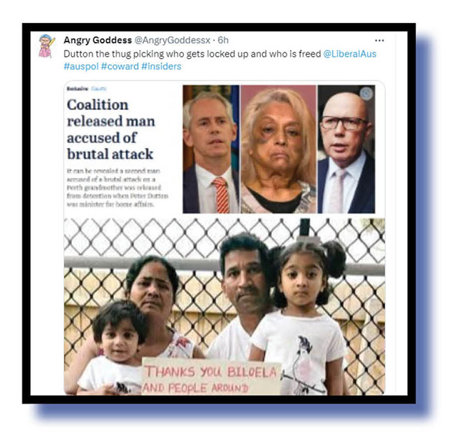 Angry Goddess and Ewart Dave roped in the plight of a certain family now happily living in Biloela to highlight Dutton’s highly politicised approach to shoring up votes … sorry… to keeping Australians safe.