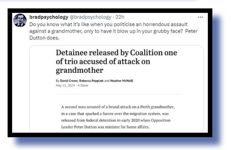 Aaron is, of course, referring to the news that among those who allegedly assaulted that WA lady to within an inch of her life was a man released by Dutton himself while in government, not someone forced to be released by a High Court decision. Big diff, people.