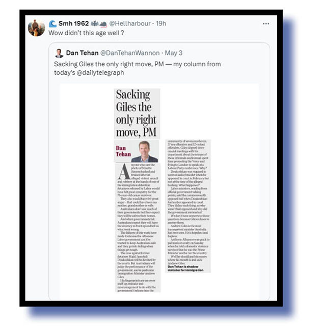 And amante2 had some wise words of advice for that endangered WA screeching parrot species Michaelia Cash and Smh 1962 poked fun at a Dan Tehan article that called for Labor heads to roll!