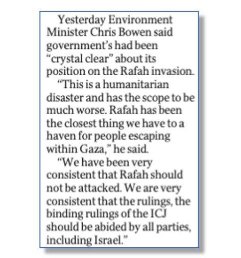 Justice Campbell cited a statement Mr Bowen had made on Saturday in which the minister had outlined the Albanese Government’s position on the recent ruling by the International Court of Justice calling on Israel to halt its military operations in the southern Gaza centre of Rafah.
